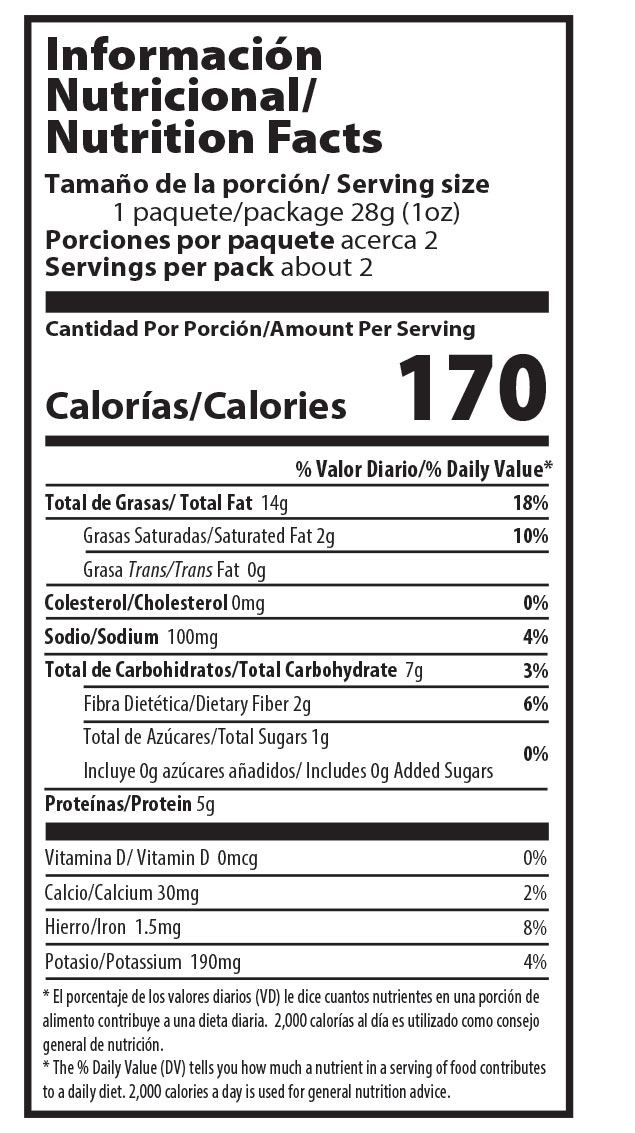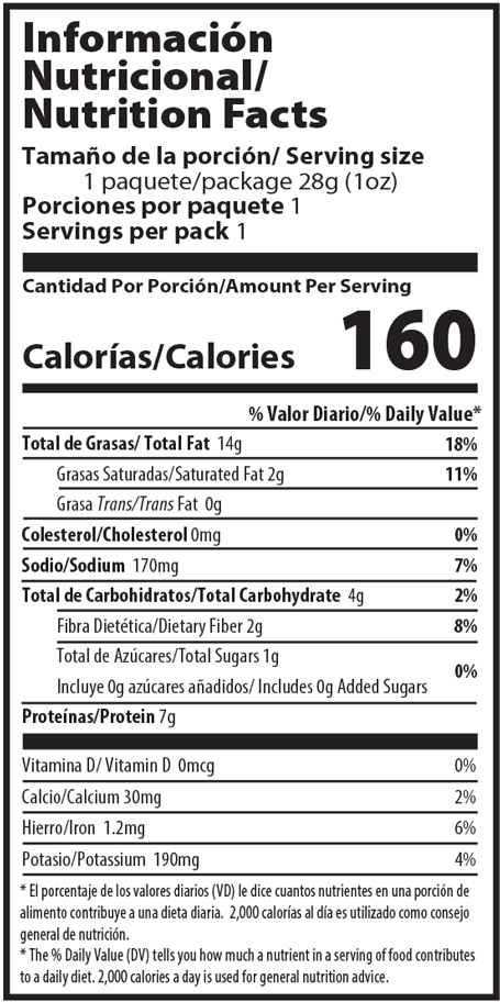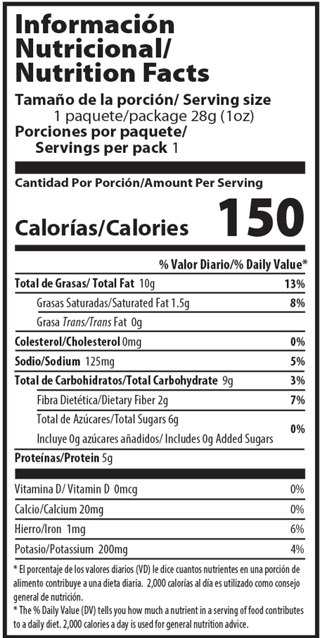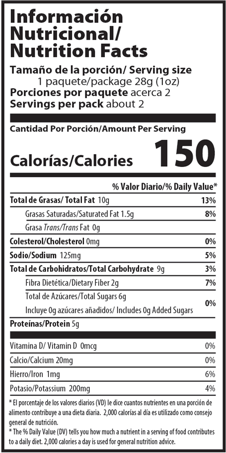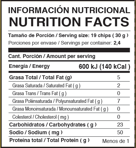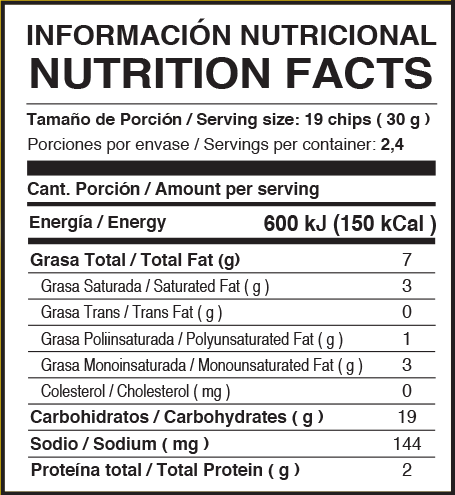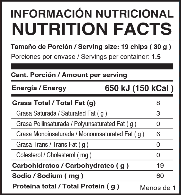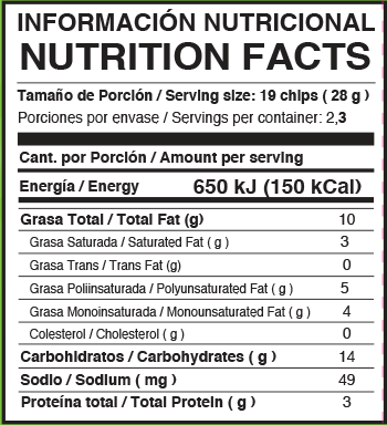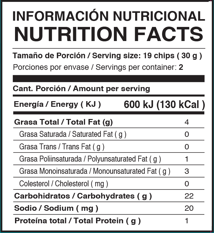 Ingredientes: Plátanos verdes, oleína de Palma/girasol/aceite de Canola, sal, maltodextrina, sabores naturales de limon, ácido málico y cítrico como acidulantes, dióxido de silicio como anti-humectantes y deshidratados vegetales (cebolla y ajo)