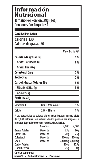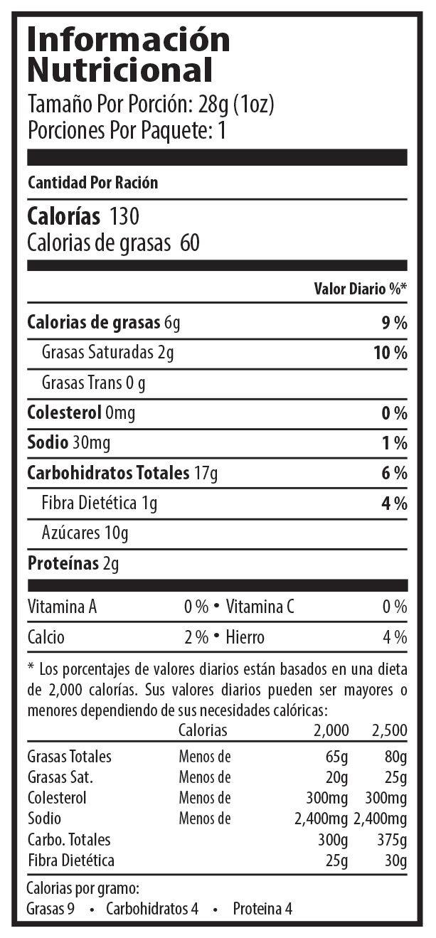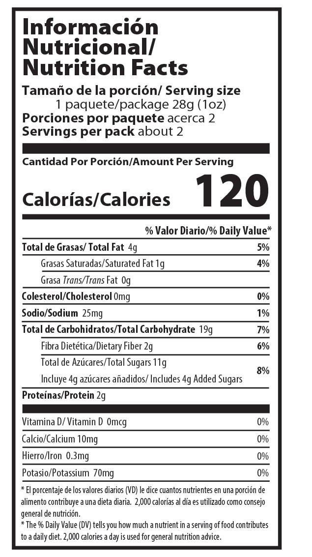 Ingredientes: Bolitas de avena y arroz (hojuelas de avena, azúcar, arroz crujiente (harina de arroz, extracto de malta [de cebada], carbonato de calcio [agente leudante], aceite de girasol, lecitina de girasol [emulsionante]), aceite de palma, miel, jarabe de azúcar caramelizado en polvo , almendras, pasas, papaya (dióxido de azufre [preservante], FD&C amarillo #5 y #6, cloruro de calcio[preservante], ácido cítrico [preservante]), piña (dióxido de sodio [preservante], ácido cítrico [preservante]).
