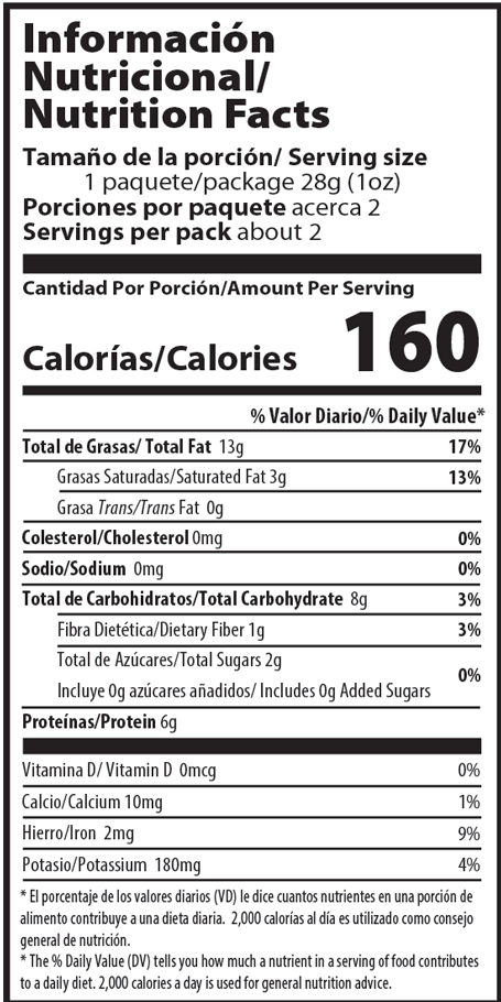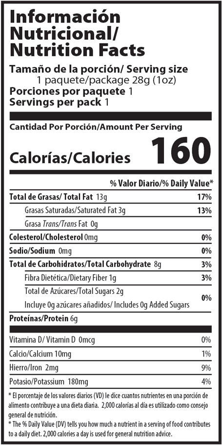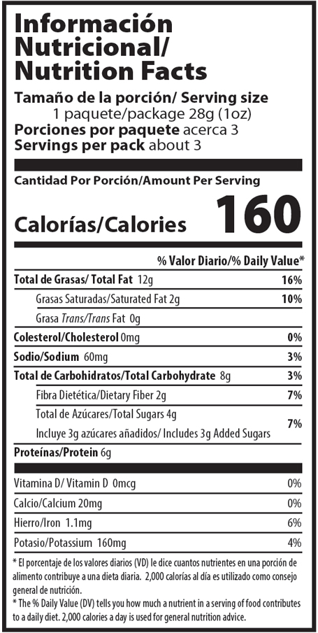 Ingredientes: Maní, pasas, papaya (dióxido de azufre, azúcar, FD & C Amarillo # 5 y # 6, cloruro de calcio, ácido cítrico), bananos, marañones, pecanas, arándanos, piña, aceite Vegetal (palmoleina / soya).