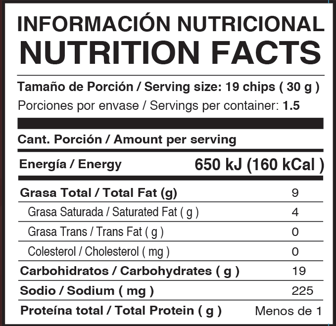 Ingredientes: Yuca, aceite girasol y/o aceita canola, sal, productos lácteos no la desnatadora, mezcla de especias deshidratadas y vegetales, dextrosa, extracto de levadura, maltodextrina, ácido málico y cítrico como acidulantes , sabores naturales y dióxido de silicio como antiaglomerante
